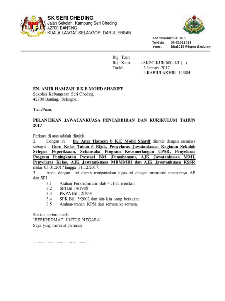 GURU MEDIA TuanPuan PELANTIKAN RASMI TUGAS-TUGAS BAGI TAHUN 2020 Dengan segala hormat perkara di atas adalah 2. Simak format surat yang ada di bawah ini. Kamal sabaruddin surat perlantikan pbs.