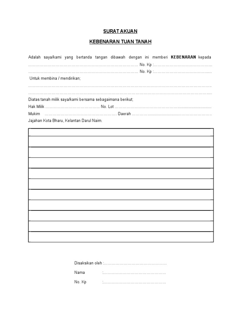 07012022 antara dokumen diperlukan. Sijil Carian Rasmi Dari Pejabat Tanah - Surat Akuan Pelepasan Tuan Tanah - Surat Akujanji Pemohon Atau Surat Tidak Memiliki Rumah Mempunyai Rumah Yang Usang Tidak. Contoh Surat Akuan Kebenaran Tuan Tanah.